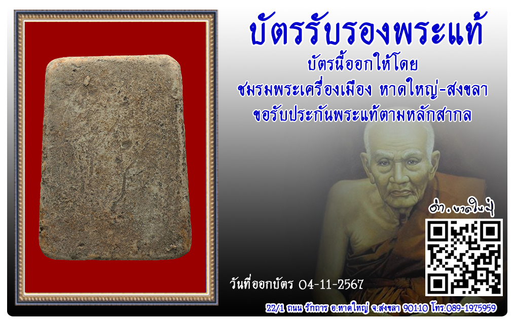 พระสมเด็จ วัดขุนอินทร์ประมูล 2567 บัตรรับรองพระแท้ 26 พ.ย. 2024 104 share tweet share ชื่อพระ : พระสมเด็จประเภท : พิมพ์ใหญ่ เนื้อผงวัด-ปี : วัดขุนอินทร์ประมูลรหัส : No.49048วันที่ออกบัตร : 04-11-2567