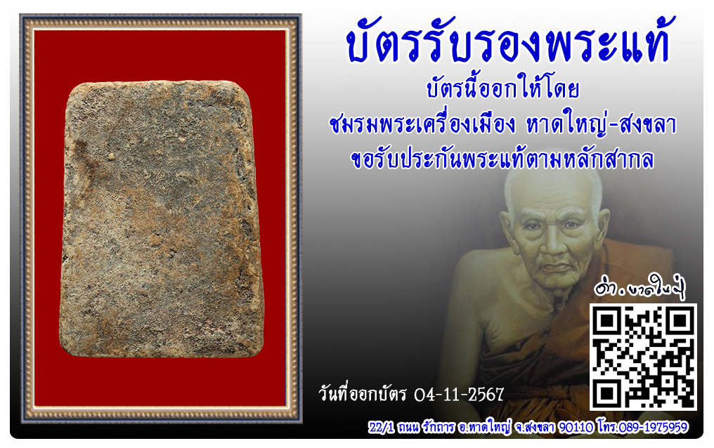 พระสมเด็จ วัดขุนอินทร์ประมูล 2567 บัตรรับรองพระแท้ 26 พ.ย. 2024 118 share tweet share ชื่อพระ : พระสมเด็จประเภท : พิมพ์ใหญ่ เนื้อผงวัด-ปี : วัดขุนอินทร์ประมูลรหัส : No.49050วันที่ออกบัตร : 04-11-2567