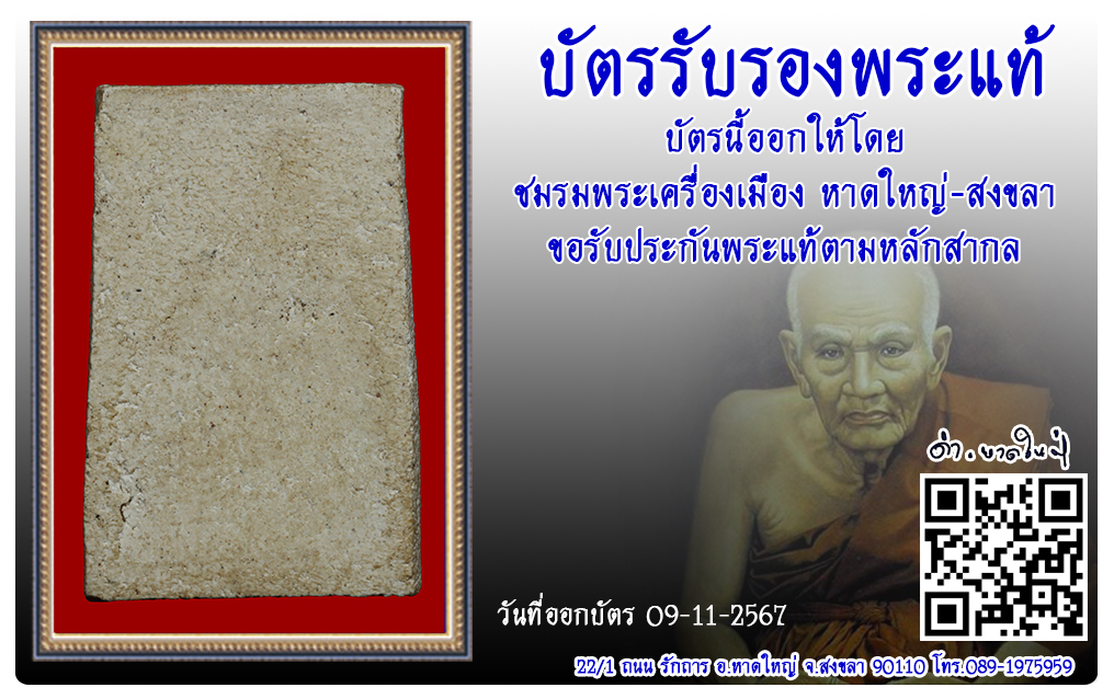 พระสมเด็จปรกโพธิ์ วัดประสาทบุญญาวาส พ.ศ.2506 2567 บัตรรับรองพระแท้ 30 พ.ย. 2024 102 share tweet share ชื่อพระ : พระสมเด็จปรกโพธิ์ประเภท : เนื้อผงวัด-ปี : วัดประสาทบุญญาวาส พ.ศ.2506รหัส : No.49128วันที่ออกบัตร : 09-11-2567