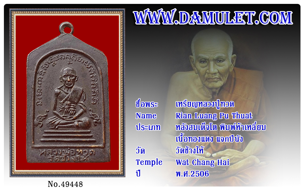 ประเภท : พิมพ์ห้าเหลี่ยม หลังสมเด็จโต เนื้อทองแดง แจกปีนัง