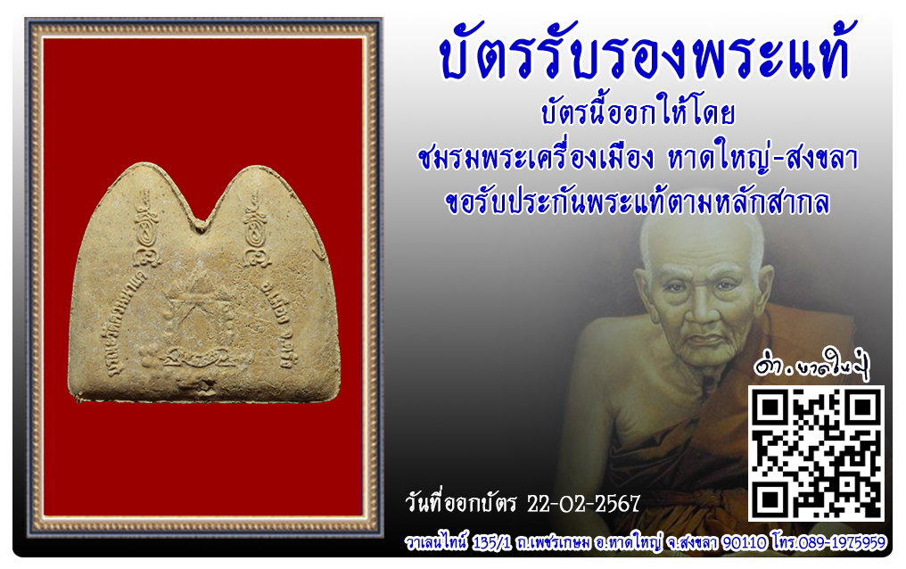 พระขุนแผนพรายคู่ วัดควนนาแค พ.ศ.2550 2568 บัตรรับรองพระแท้ 05 มี.ค. 2025 115 share tweet share ชื่อพระ : พระขุนแผนพรายคู่ประเภท : รุ่น 2 เนื้อว่านวัด-ปี : วัดควนนาแค พ.ศ.2550รหัส : No.50045วันที่ออกบัตร : 22-02-2568