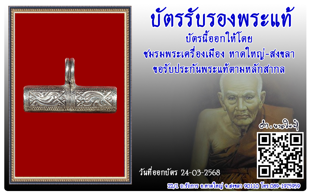 ตะกรุดเงิน อาจารย์นอง วัดทรายขาว 2568 บัตรรับรองพระแท้ 22 เม.ย. 2025 99 share tweet share ชื่อพระ : ตะกรุดเงินชื่อหลวงพ่อ : อาจารย์นองประเภท : ดอกเล็กวัด : วัดทรายขาวรหัส : No.50422วันที่ออกบัตร : 24-03-2568