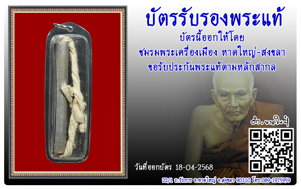 ตะกรุดโทน อาจารย์ปาล วัดเขาอ้อ พ.ศ.2480-2490 2568 บัตรรับรองพระแท้ 14 ก.ค. 2025 74 share tweet share ชื่อพระ : ตะกรุดโทนชื่อหลวงพ่อ : อาจารย์ปาลวัด-ปี : วัดเขาอ้อ พ.ศ.2480-2490รหัส : No.50818วันที่ออกบัตร : 18-04-2568