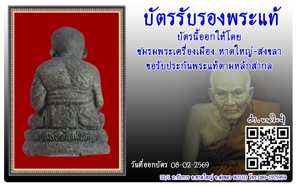 หลวงปู่ทวด วัดสะบ้าย้อย 2569 บัตรรับรองพระแท้ D-Amulet 05 เม.ย. 2026 15 share tweet share ชื่อพระ : หลวงปู่ทวดประเภท : รุ่นเสินเจิ้น เนื้อว่านวัด-ปี : วัดสะบ้าย้อยรหัส :No.53331วันที่ออกบัตร : 08-02-2569