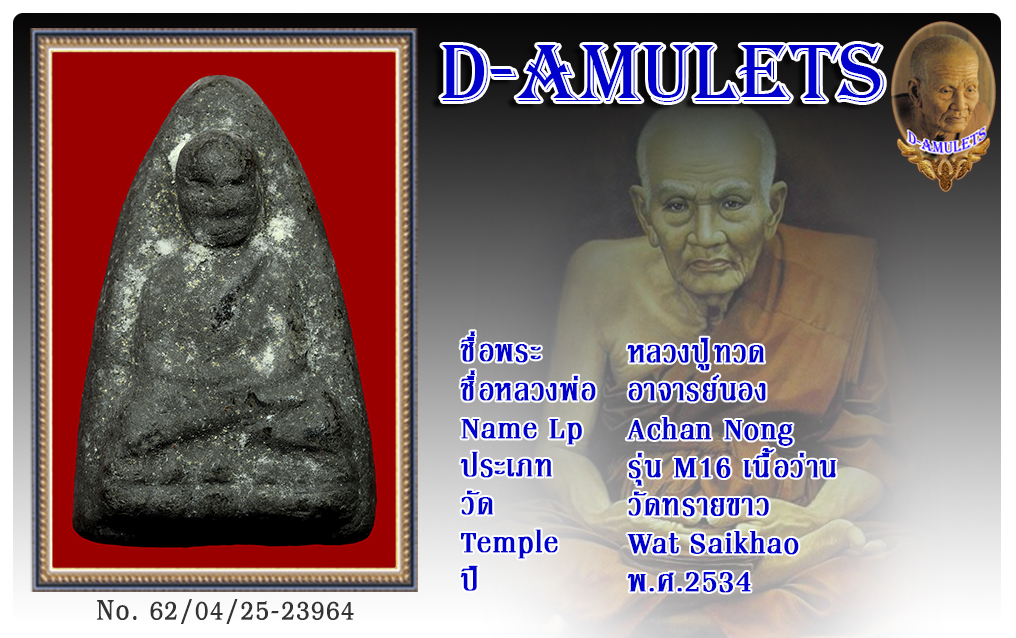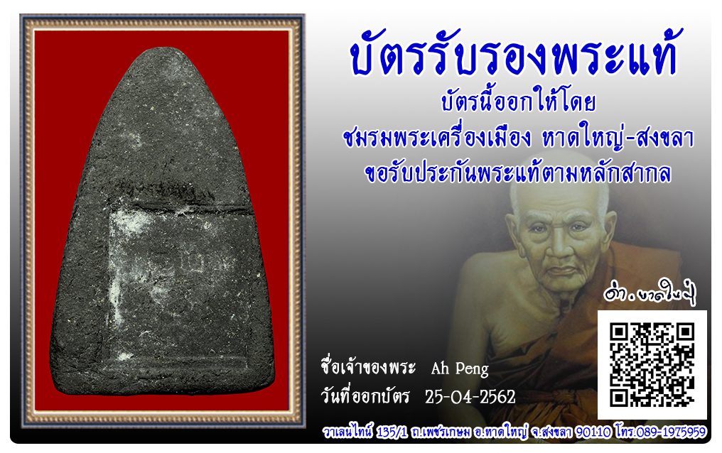 หลวงปู่ทวด อาจารย์นอง วัดทรายขาว พ.ศ.2534 2562 25 เม.ย. 2019 229 share tweet share ชื่อพระ : หลวงปู่ทวด ชื่อหลวงพ่อ : อาจารย์นอง ประเภท : รุ่น M16 เนื้อว่าน วัด-ปี : วัดทรายขาว พ.ศ.2534 รหัส : No.62/04/25/23964 เจ้าของพระ : Ah Peng