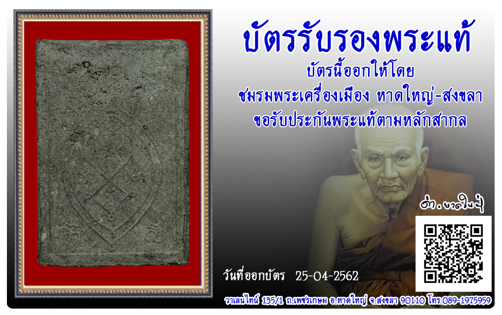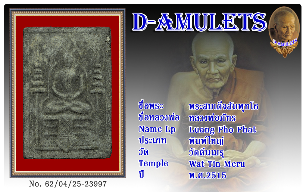 พระสมเด็จสัมพุทโธ หลวงพ่อภัทร วัดตีนเมรุ พ.ศ.2515 2562 25 เม.ย. 2019 502 share tweet share ชื่อพระ : พระสมเด็จสัมพุทโธ ชื่อหลวงพ่อ : หลวงพ่อภัทร ประเภท : พิมพ์ใหญ่ วัด-ปี : วัดตีนเมรุ พ.ศ.2515 รหัส : No.62/04/25/23997