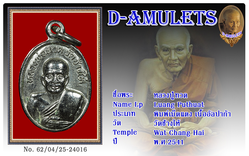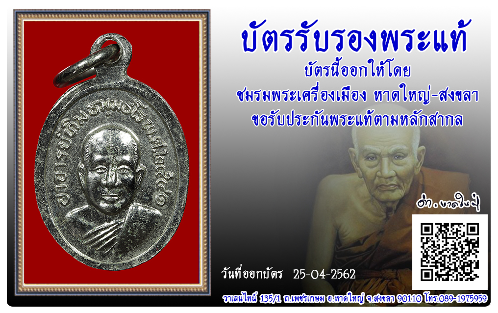 หลวงปู่ทวด วัดช้างให้ พ.ศ.2541 2562 25 เม.ย. 2019 259 share tweet share ชื่อพระ : หลวงปู่ทวด ประเภท : พิมพ์เม็ดแตง เนื้ออัลปาก้า วัด-ปี : วัดช้างให้ พ.ศ.2541 รหัส : No.62/04/25/24016