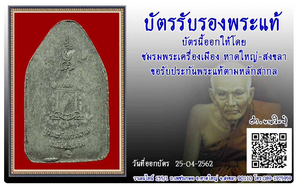 พระขุนแผนพรายกุมาร วัดควนนาแค พ.ศ.2549 2562 25 เม.ย. 2019 239 share tweet share ชื่อพระ : พระขุนแผนพรายกุมาร ประเภท : รุ่น 2 วัด-ปี : วัดควนนาแค พ.ศ.2549 รหัส : No.62/04/25/24017