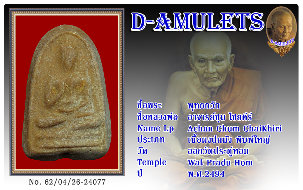 พุทธกวัก อาจารย์ชุม ไชยคีรี ออกวัดประดู่หอม พ.ศ.2494 2562 26 เม.ย. 2019 292 share tweet share ชื่อพระ : พุทธกวัก ชื่อหลวงพ่อ : อาจารย์ชุม ไชยคีรี ประเภท : เนื้อผงปถมัง พิมพ์ใหญ่ วัด-ปี : ออกวัดประดู่หอม พ.ศ.2494 รหัส : No.62/04/26/24077 เจ้าของพระ : KBG Amulet