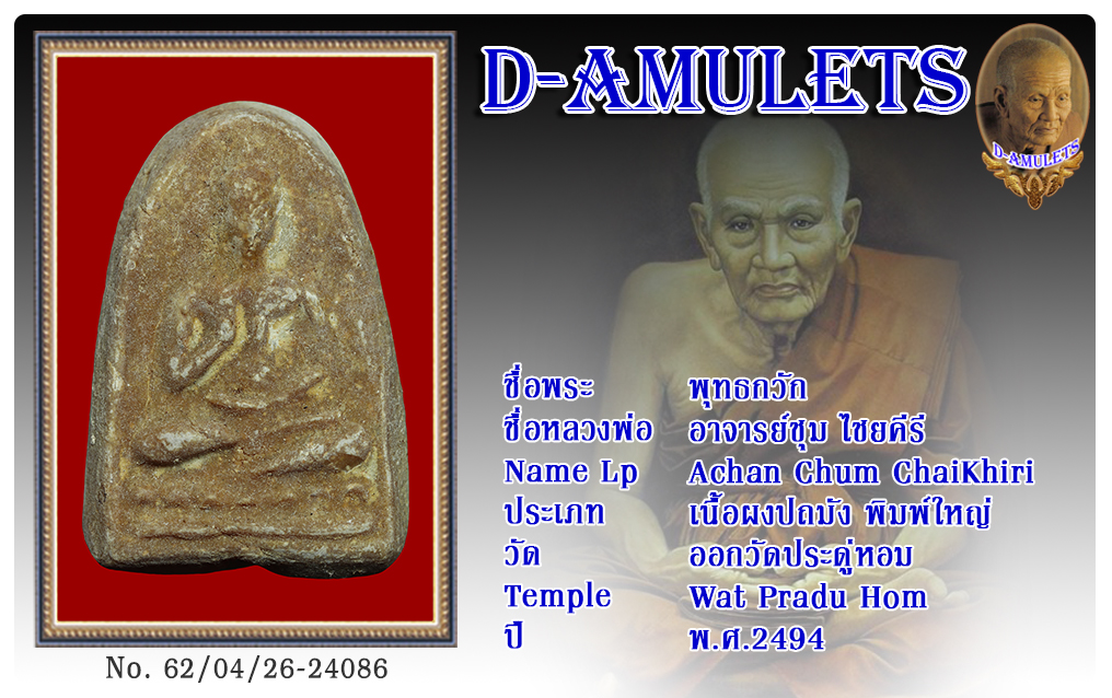 พุทธกวัก อาจารย์ชุม ไชยคีรี ออกวัดประดู่หอม พ.ศ.2494 2562 26 เม.ย. 2019 250 share tweet share ชื่อพระ : พุทธกวัก ชื่อหลวงพ่อ : อาจารย์ชุม ไชยคีรี ประเภท : เนื้อผงปถมัง พิมพ์ใหญ่ วัด-ปี : ออกวัดประดู่หอม พ.ศ.2494 รหัส : No.62/04/26/24086 เจ้าของพระ : KBG Amulet