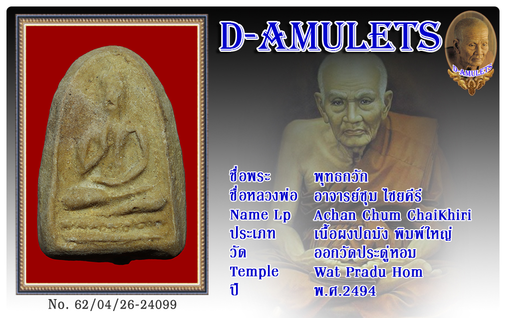 พุทธกวัก อาจารย์ชุม ไชยคีรี ออกวัดประดู่หอม พ.ศ.2494 2562 26 เม.ย. 2019 245 share tweet share ชื่อพระ : พุทธกวัก ชื่อหลวงพ่อ : อาจารย์ชุม ไชยคีรี ประเภท : เนื้อผงปถมัง พิมพ์ใหญ่ วัด-ปี : ออกวัดประดู่หอม พ.ศ.2494 รหัส : No.62/04/26/24099 เจ้าของพระ : KBG Amulet