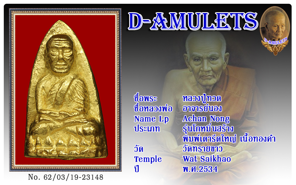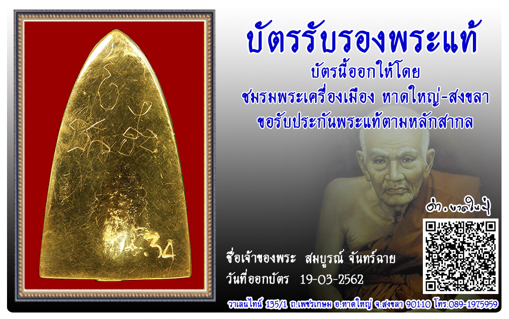 หลวงปู่ทวด อาจารย์นอง วัดทรายขาว พ.ศ.2534 2562 19 มี.ค. 2019 750 share tweet share ชื่อพระ : หลวงปู่ทวด ชื่อหลวงพ่อ : อาจารย์นอง ประเภท : รุ่นโกหมิ่นสร้าง พิมพ์เตารีดใหญ่ เนื้อทองคำ วัด-ปี : วัดทรายขาว พ.ศ.2534 รหัส : No.62/03/19/23148 ชื่อเจ้าของพระ สมบูรณ์ จันทร์ฉาย