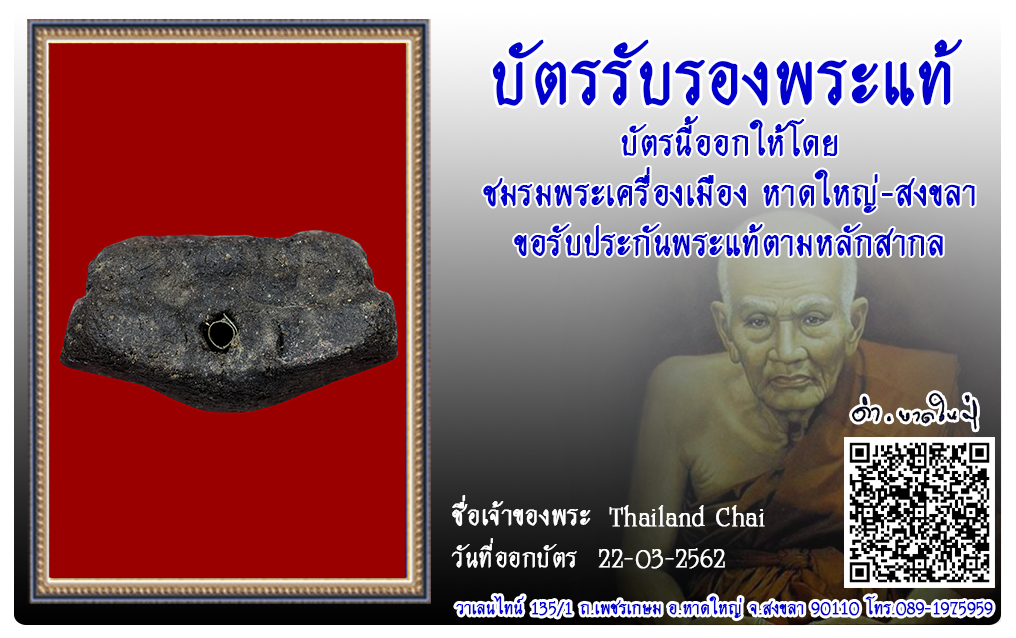 หลวงปู่ทวด อาจารย์นอง วัดทรายขาว พ.ศ.2540 2562 22 มี.ค. 2019 232 share tweet share ชื่อพระ : หลวงปู่ทวด ชื่อหลวงพ่อ : อาจารย์นอง ประเภท : รุ่นสร้างมณทป เนื้อว่าน พิมพ์ใหญ่ ฝังตะกรุดเงิน วัด-ปี : วัดทรายขาว พ.ศ.2540 รหัส : No.62/03/22/23198 ชื่อเจ้าของพระ Thailand Chai