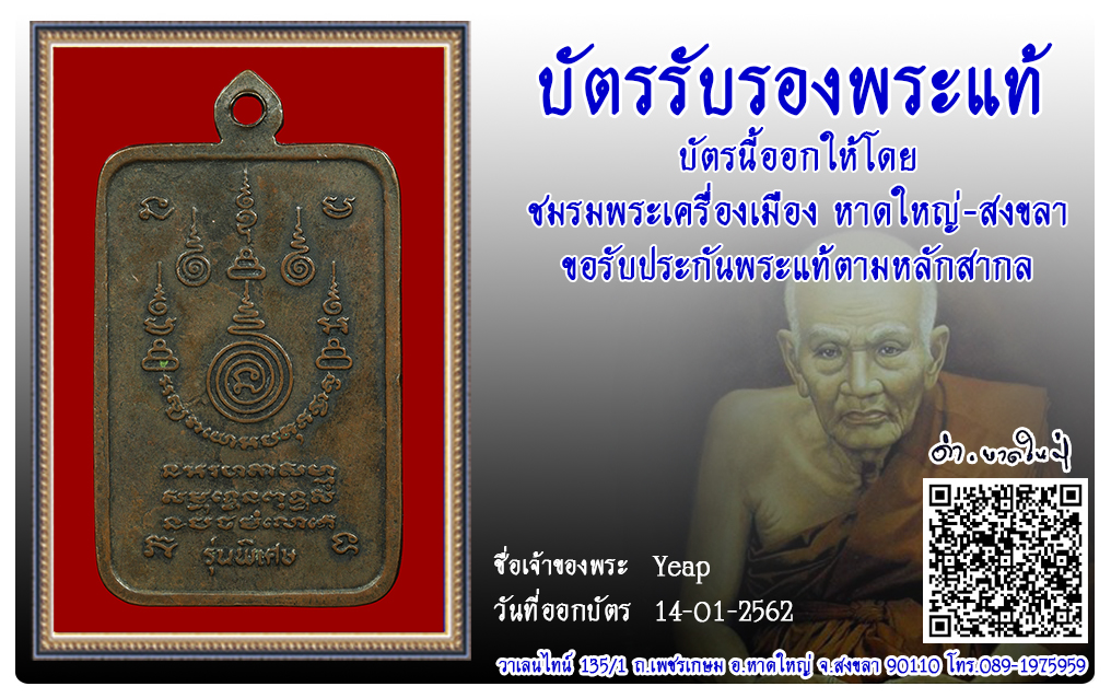 เหรียญหลวงพ่อมหาลอย วัดแหลมจาก พ.ศ.2523 2562 14 ม.ค. 2019 558 share tweet share ชื่อพระ : เหรียญหลวงพ่อมหาลอย ประเภท : เนื้อทองแดง วัด-ปี : วัดแหลมจาก พ.ศ.2523 รหัส : No.62/01/14/21960 เจ้าของพระ : Yeap