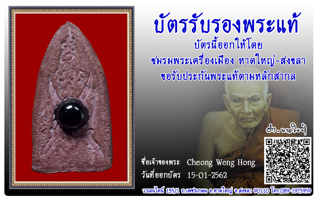 พระขุนแผน หลังดาบไขว้ อาจารย์ชุม ไชยคีรี วัดถ้ำเงิน พ.ศ.2497 2562 15 ม.ค. 2019 351 share tweet share ชื่อพระ : พระขุนแผน หลังดาบไขว้ ชื่อหลวงพ่อ : อาจารย์ชุม ไชยคีรี ประเภท : ติดเหล็กไหล วัด-ปี : วัดถ้ำเงิน พ.ศ.2497 รหัส : No.62/01/15/21985 เจ้าของพระ : Cheong Weng Hong
