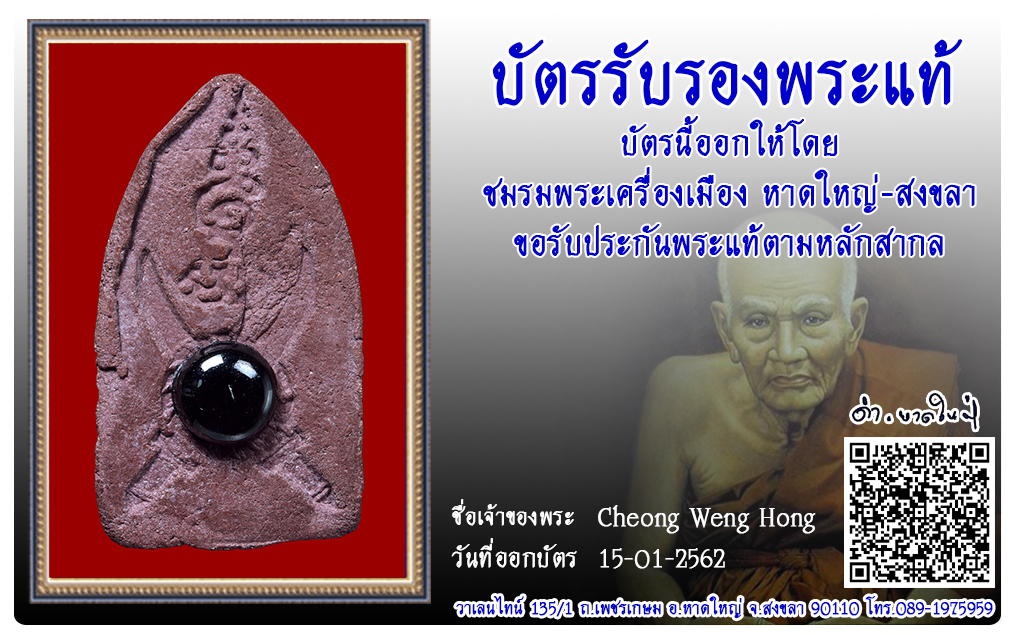 พระขุนแผน หลังดาบไขว้ อาจารย์ชุม ไชยคีรี วัดถ้ำเงิน พ.ศ.2497 2562 15 ม.ค. 2019 464 share tweet share ชื่อพระ : พระขุนแผน หลังดาบไขว้ ชื่อหลวงพ่อ : อาจารย์ชุม ไชยคีรี ประเภท : ติดเหล็กไหล วัด-ปี : วัดถ้ำเงิน พ.ศ.2497 รหัส : No.62/01/15/21986 เจ้าของพระ : Cheong Weng Hong