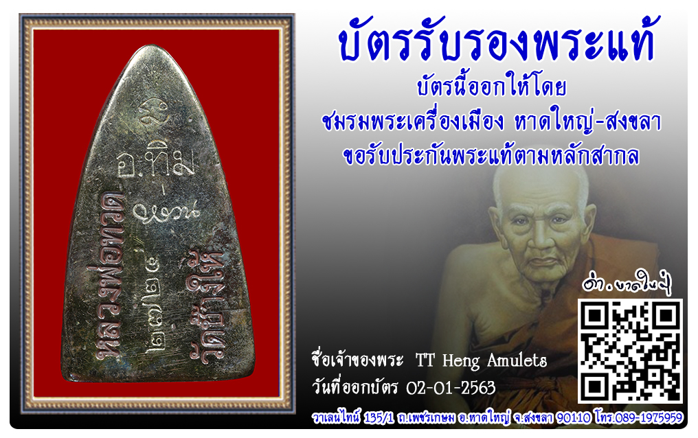 หลวงปู่ทวด วัดช้างให้ พ.ศ.2558 2563 02 ม.ค. 2020 644 share tweet share ชื่อพระ : หลวงปู่ทวด ประเภท : รุ่นสร้างพิพิธภัณฑ์ พิมพ์เตารีดใหญ่ เนื้อนวะ No.2724 วัด-ปี : วัดช้างให้ พ.ศ.2558 รหัส : No.28009 วันที่ออกบัตร : 02-01-2563 เจ้าของพระ : TT Heng Amulets