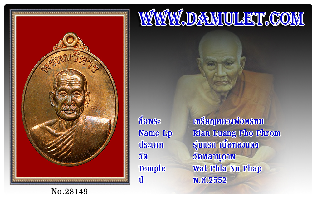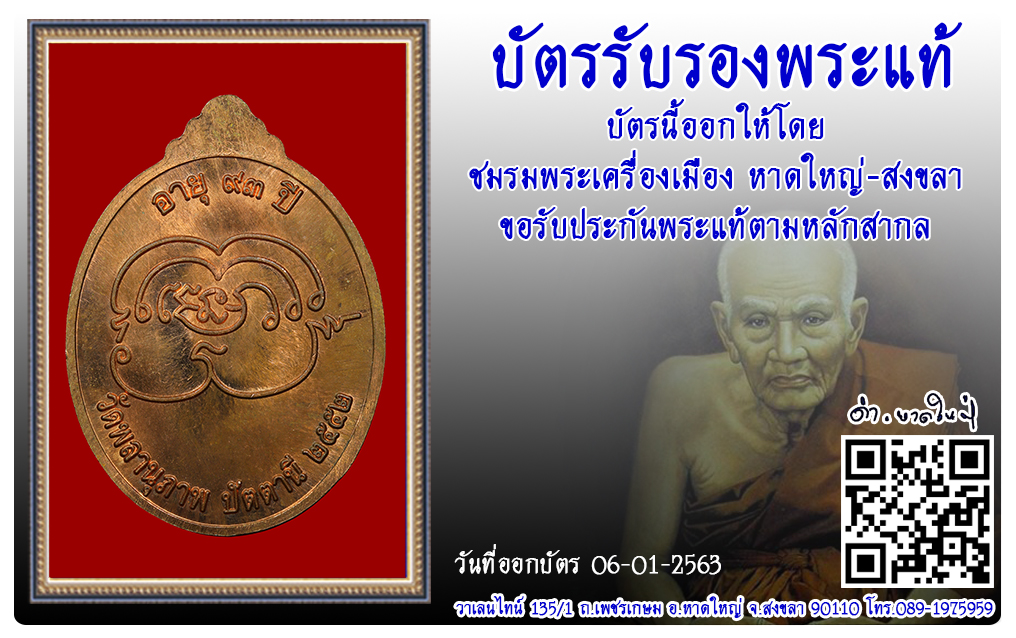 เหรียญหลวงพ่อพรหม วัดพลานุภาพ พ.ศ.2552 2563 06 ม.ค. 2020 443 share tweet share ชื่อพระ : เหรียญหลวงพ่อพรหม ประเภท : รุ่นแรก เนื้อทองแดง วัด-ปี : วัดพลานุภาพ พ.ศ.2552 รหัส : No.28149 วันที่ออกบัตร : 06-01-2563