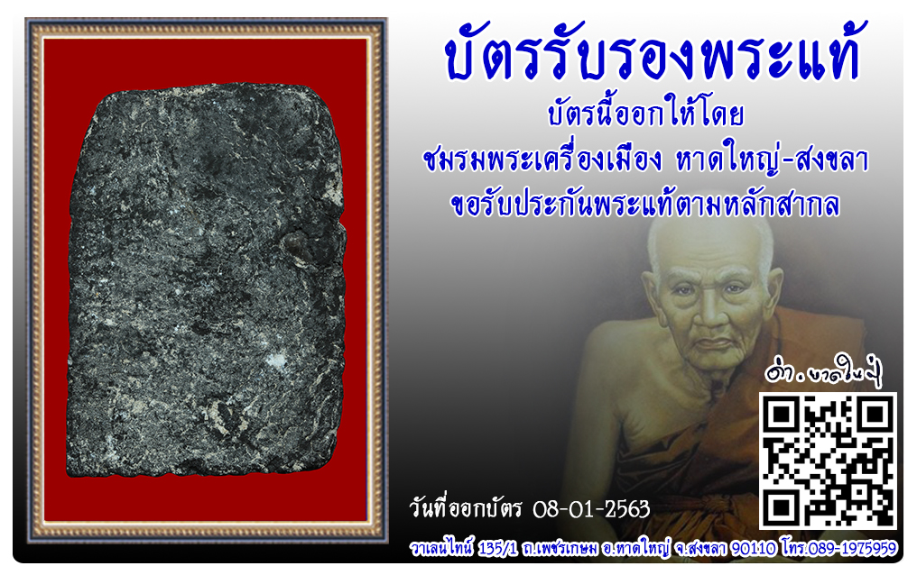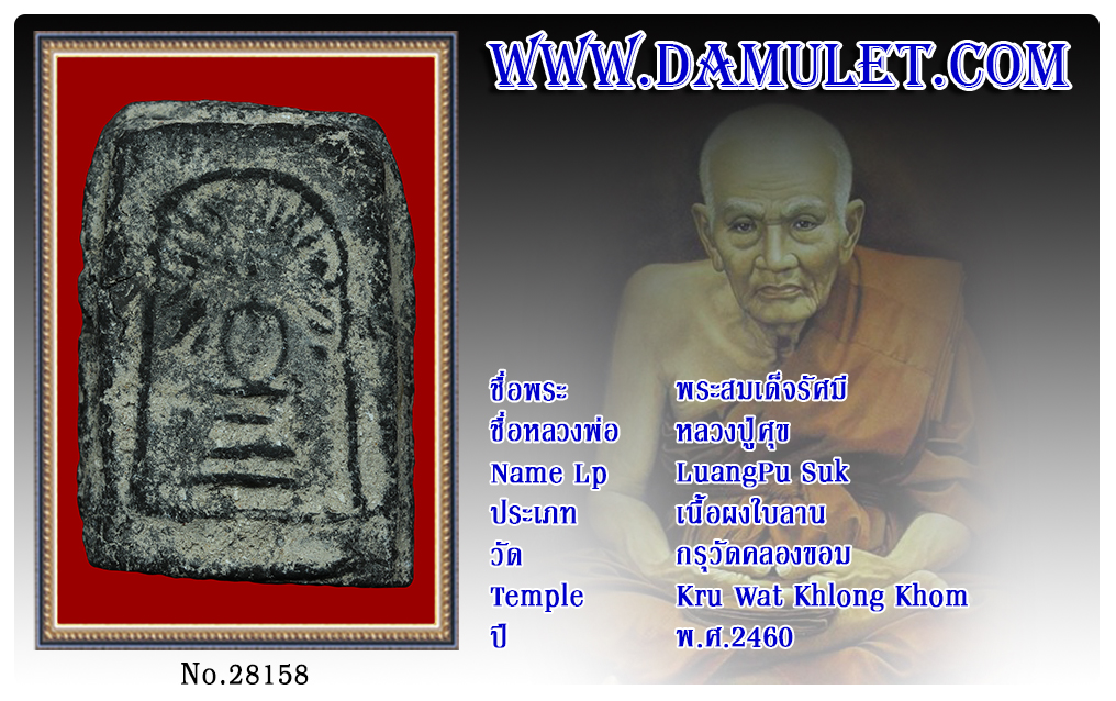 พระสมเด็จรัศมี หลวงปู่ศุข กรุวัดคลองขอม พ.ศ.2460 2563 08 ม.ค. 2020 364 share tweet share ชื่อพระ : พระสมเด็จรัศมี ชื่อหลวงพ่อ : หลวงปู่ศุข ประเภท : เนื้อผงใบลาน วัด-ปี : กรุวัดคลองขอม พ.ศ.2460 รหัส : No.28158 วันที่ออกบัตร : 08-01-2563