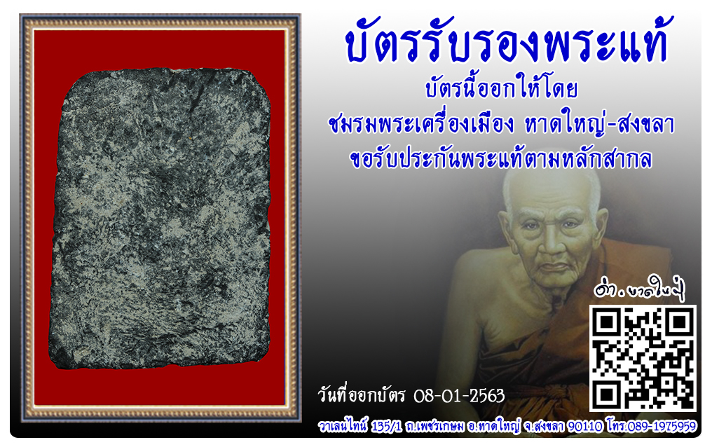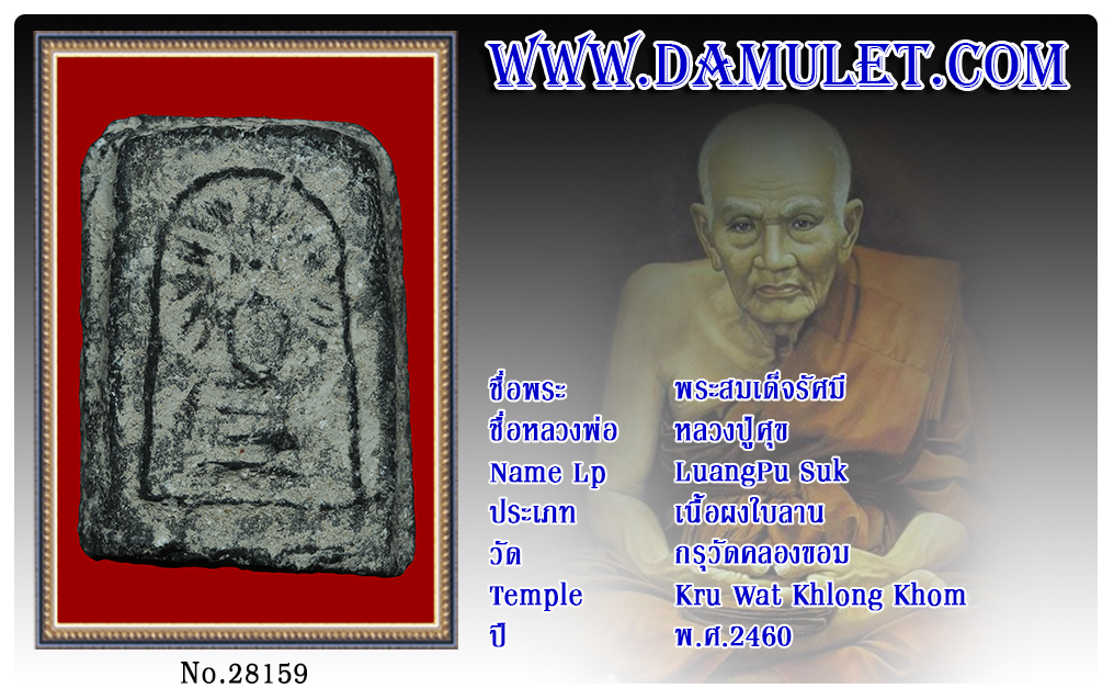พระสมเด็จรัศมี หลวงปู่ศุข กรุวัดคลองขอม พ.ศ.2460 2563 08 ม.ค. 2020 405 share tweet share ชื่อพระ : พระสมเด็จรัศมี ชื่อหลวงพ่อ : หลวงปู่ศุข ประเภท : เนื้อผงใบลาน วัด-ปี : กรุวัดคลองขอม พ.ศ.2460 รหัส : No.28159 วันที่ออกบัตร : 08-01-2563