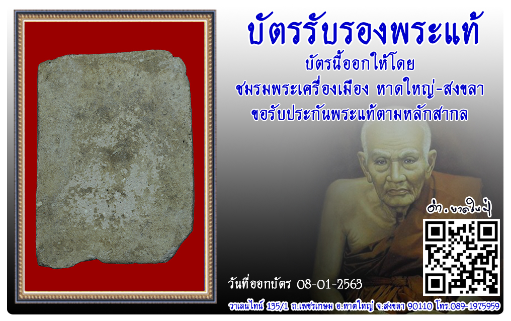 พระสมเด็จรัศมี หลวงปู่ศุข กรุวัดคลองขอม พ.ศ.2460 2563 08 ม.ค. 2020 380 share tweet share ชื่อพระ : พระสมเด็จรัศมี ชื่อหลวงพ่อ : หลวงปู่ศุข ประเภท : เนื้อผงขาว วัด-ปี : กรุวัดคลองขอม พ.ศ.2460 รหัส : No.28160 วันที่ออกบัตร : 08-01-2563
