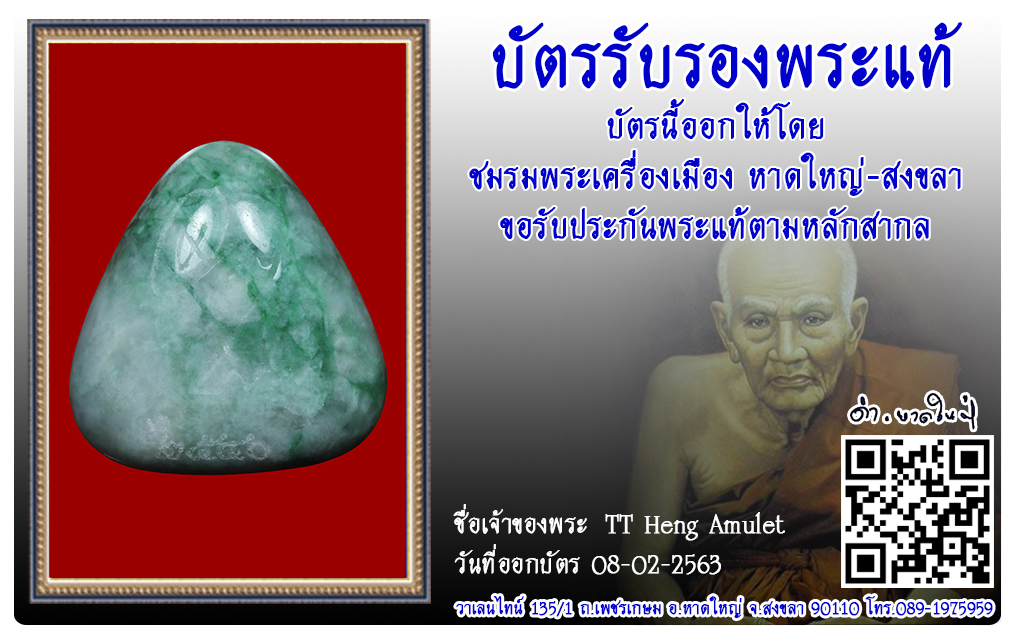 พระดูดทรัพย์ วัดพระธรรมกาย พ.ศ.2540 2563 08 ก.พ. 2020 1064 share tweet share ชื่อพระ : พระดูดทรัพย์ ประเภท : เนื้อหยกเขียว วัด-ปี : วัดพระธรรมกาย พ.ศ.2540 รหัส : No.28366 วันที่ออกบัตร : 08-02-2563 เจ้าของพระ : TT Heng Amulet