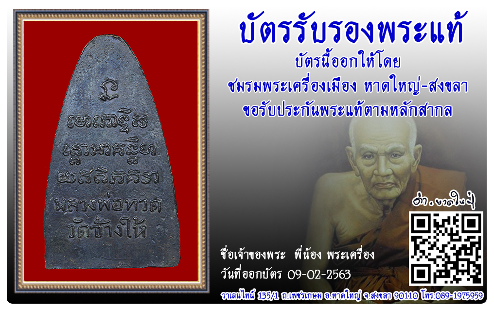 หลวงปู่ทวด วัดช้างให้ 2505 2563 09 ก.พ. 2020 327 share tweet share ชื่อพระ : หลวงปู่ทวด ประเภท : หลังหนังสือ พิมพ์ใหญ่ บล็อคสายฝน วัด-ปี : วัดช้างให้ 2505 รหัส : No.28421 วันที่ออกบัตร : 09-02-2563 ชื่อเจ้าของพระ : พี่น้อง พระเครื่อง