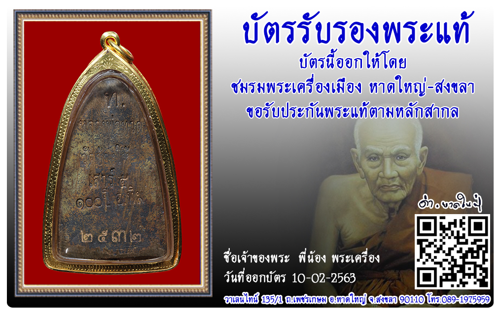 หลวงปู่ทวด วัดช้างให้ 2555 2563 09 ก.พ. 2020 364 share tweet share ชื่อพระ : หลวงปู่ทวด ประเภท : รุ่น 100 ปี พิมพ์เตารีดใหญ่ A เนื้อสำริด No.2532 วัด-ปี : วัดช้างให้ 2555 รหัส : No.28426 วันที่ออกบัตร : 10-02-2563 ชื่อเจ้าของพระ : พี่น้อง พระเครื่อง
