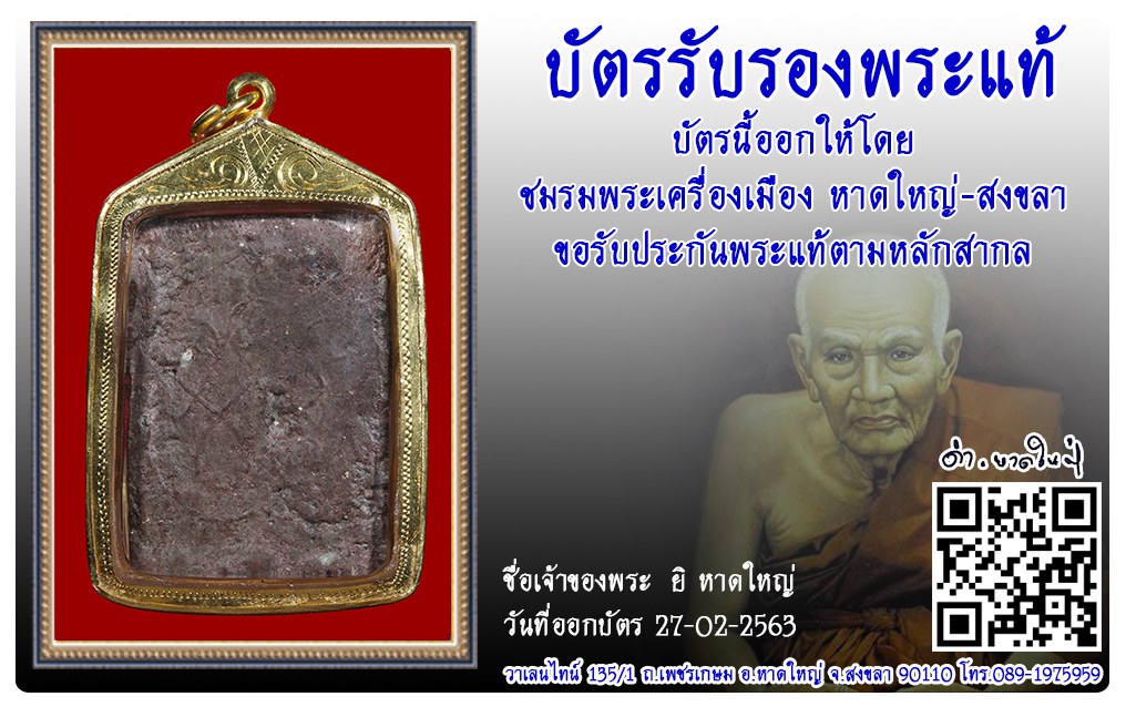 พระเจ้าห้าพระองค์ วัดหลักห้า พ.ศ.2503 2563 27 ก.พ. 2020 295 share tweet share ชื่อพระ : พระเจ้าห้าพระองค์ ประเภท : เนื้อผงผสมว่าน วัด-ปี : วัดหลักห้า พ.ศ.2503 รหัส : No.28911 วันที่ออกบัตร : 27-02-2563 เจ้าของพระ : ยิ หาดใหญ่