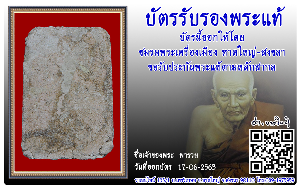 พระสมเด็จรัศมี หลวงปู่ศุข กรุวัดคลองขอม พ.ศ.2460 2563 17 มิ.ย. 2020 291 share tweet share ชื่อพระ : พระสมเด็จรัศมีชื่อหลวงพ่อ : หลวงปู่ศุขประเภท : เนื้อผงขาววัด-ปี : กรุวัดคลองขอม พ.ศ.2460รหัส : No.30765วันที่ออกบัตร : 17-06-2563เจ้าของพระ : พารวย