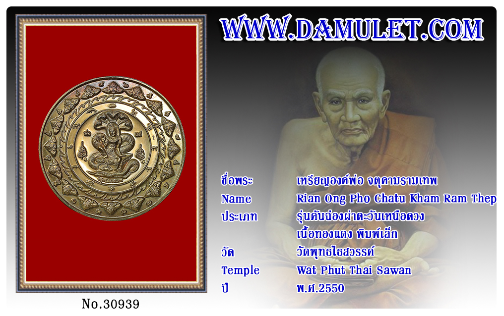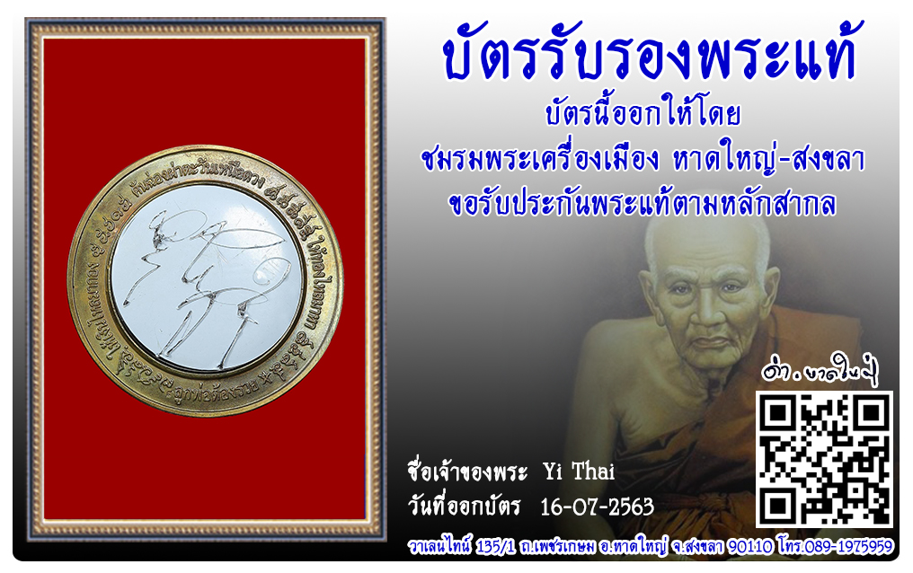 เหรียญองค์พ่อจตุคามรามเทพ วัดพุทธไธสวรรค์ พ.ศ.2550 2563 16 ก.ค. 2020 306 share tweet share ชื่อพระ : เหรียญองค์พ่อจตุคามรามเทพประเภท : รุ่นคันฉ่องผ่าตะวันเหนือดวง เนื้อทองแดง พิมพ์เล็กวัด-ปี : วัดพุทธไธสวรรค์ พ.ศ.2550รหัส : No.30939วันที่ออกบัตร : 16-07-2563เจ้าของพระ : Yi Thai