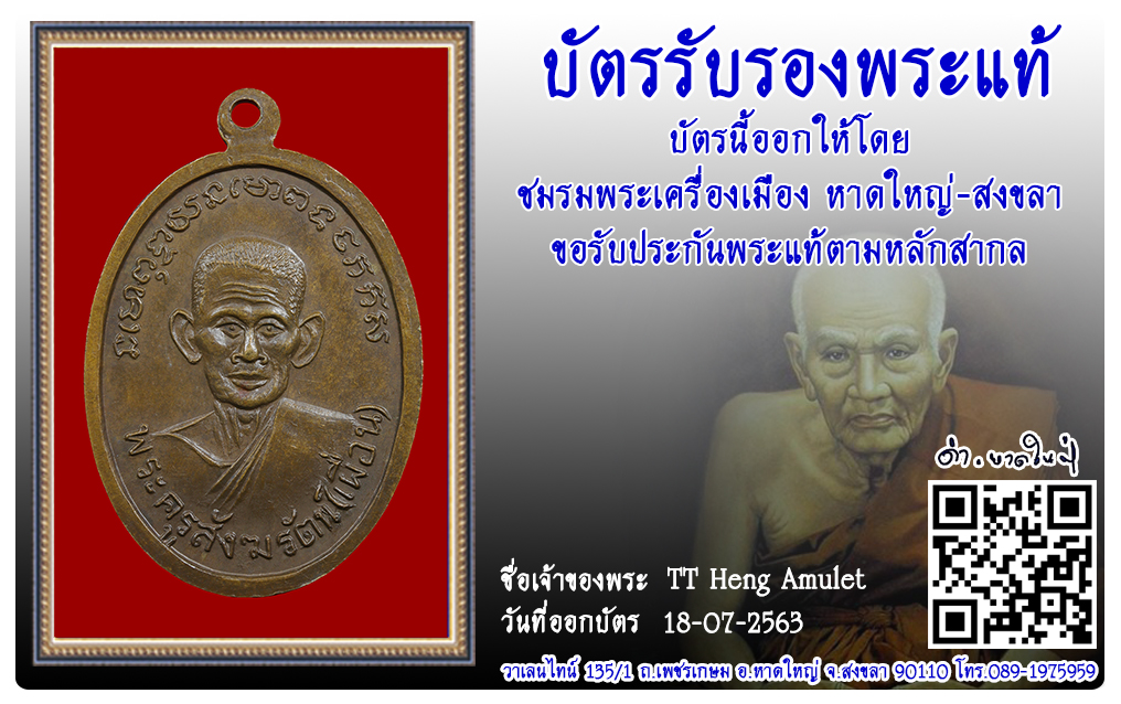 เหรียญหลวงปู่เมือง วัดดอนทราย พ.ศ.2513 2563 18 ก.ค. 2020 935 share tweet share ชื่อพระ : เหรียญหลวงปู่เมืองประเภท : หลังหลวงพ่อเผื่อน เนื้อทองแดงวัด-ปี : วัดดอนทราย พ.ศ.2513รหัส : No.31007วันที่ออกบัตร : 18-07-2563เจ้าของพระ : TT Heng Amulet