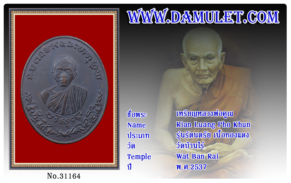 เหรียญหลวงพ่อคูณ วัดบ้านไร่ พ.ศ.2537 2563 27 ก.ค. 2020 355 share tweet share ชื่อพระ : เหรียญหลวงพ่อคูณประเภท : รุ่นรัตนตรัย เนื้อทองแดงวัด-ปี : วัดบ้านไร่ พ.ศ.2537รหัส : No.31164วันที่ออกบัตร : 25-07-2563เจ้าของพระ : TT Heng Amulet