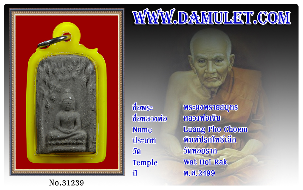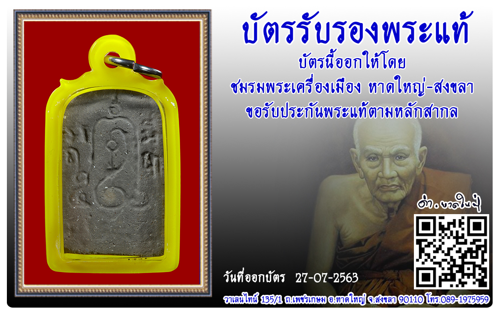 พระผงพรายสมุทร หลวงพ่อเจิม วัดหอยราก พ.ศ.2499 2563 27 ก.ค. 2020 302 share tweet share ชื่อพระ : พระผงพรายสมุทรชื่อหลวงพ่อ : หลวงพ่อเจิมประเภท : พิมพ์ปรกโพธิ์เล็กวัด-ปี : วัดหอยราก พ.ศ.2499รหัส : No.31239วันที่ออกบัตร : 27-07-2563