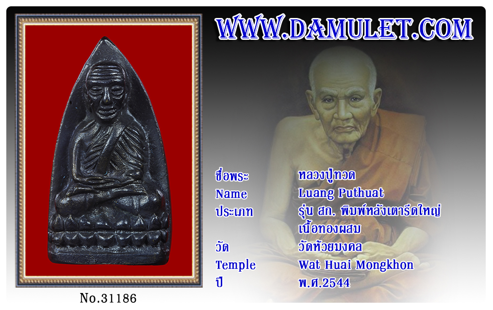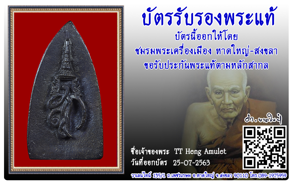 หลวงปู่ทวด วัดห้วยมงคล พ.ศ.2544 2563 25 ก.ค. 2020 473 share tweet share ชื่อพระ : หลวงปู่ทวดประเภท : รุ่น สก. พิมพ์หลังเตารีดใหญ่ เนื้อทองผสมวัด-ปี : วัดห้วยมงคล พ.ศ.2544รหัส : No.31186วันที่ออกบัตร : 25-07-2563เจ้าของพระ : TT Heng Amulet