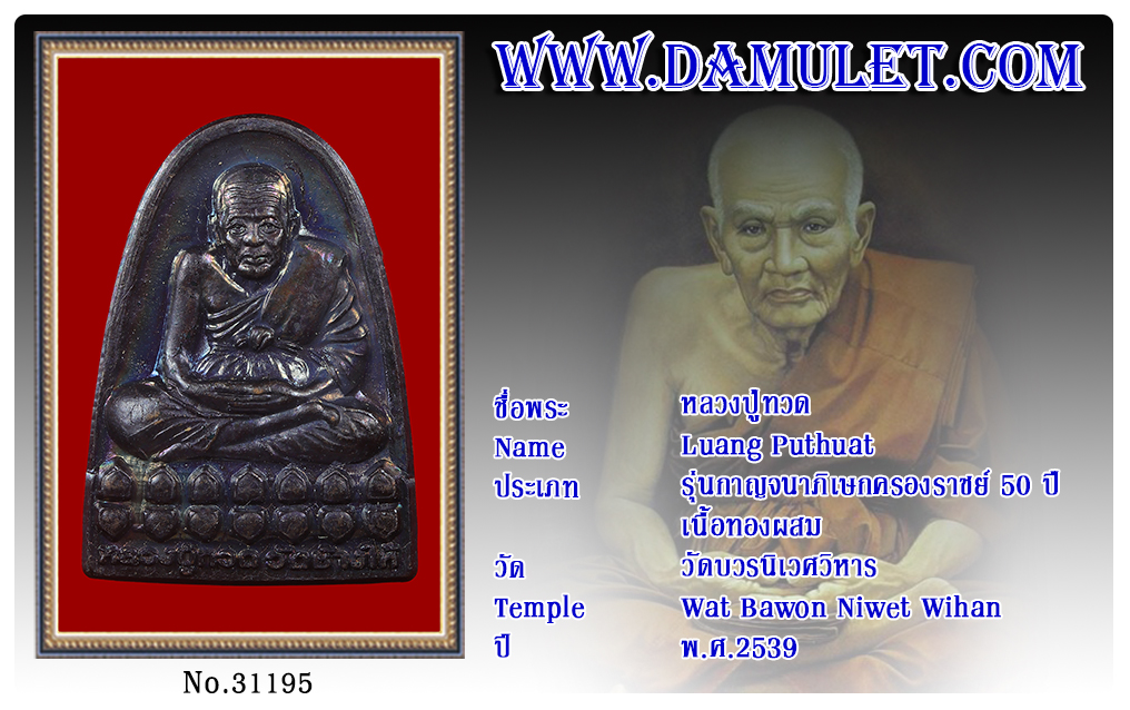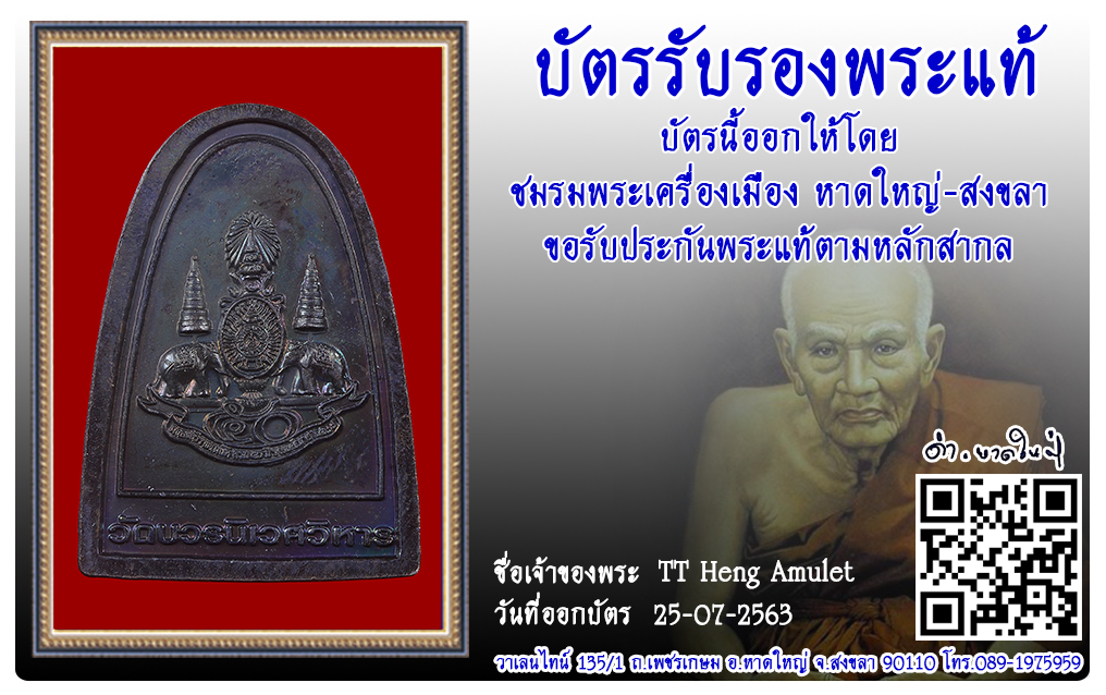หลวงปู่ทวด วัดบวรนิเวศวิหาร พ.ศ.2539 2563 25 ก.ค. 2020 700 share tweet share ชื่อพระ : หลวงปู่ทวดประเภท : รุ่นกาญจนาภิเษกครองราชย์ 50 ปี เนื้อทองผสมวัด-ปี : วัดบวรนิเวศวิหาร พ.ศ.2539รหัส : No.31195วันที่ออกบัตร : 25-07-2563เจ้าของพระ : TT Heng Amulet