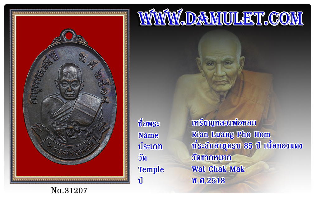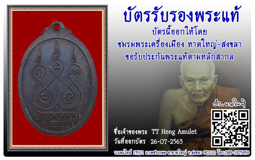 เหรียญหลวงพ่อหอม วัดชากหมาก พ.ศ.2518 2563 26 ก.ค. 2020 806 share tweet share ชื่อพระ : เหรียญหลวงพ่อหอมประเภท : ที่ระลึกอายุครบ 85 ปี เนื้อทองแดงวัด-ปี : วัดชากหมาก พ.ศ.2518รหัส : No.31207วันที่ออกบัตร : 26-07-2563เจ้าของพระ : TT Heng Amulet