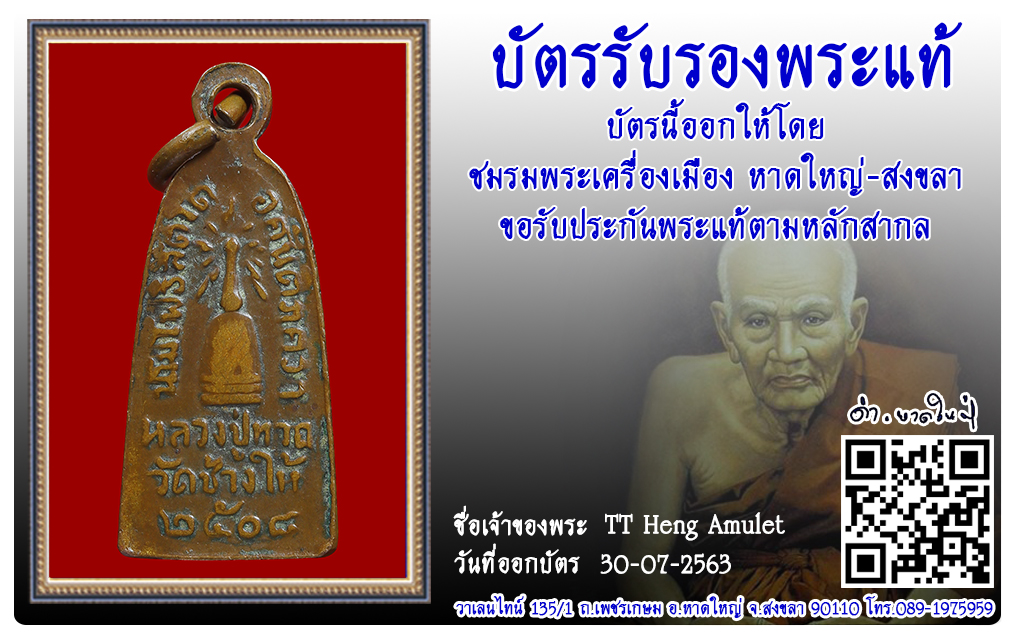 หลวงปู่ทวด วัดช้างให้ พ.ศ.2508 2563 30 ก.ค. 2020 270 share tweet share ชื่อพระ : หลวงปู่ทวดประเภท : รุ่นทะเลซุง พิมพ์เล็กวัด-ปี : วัดช้างให้ พ.ศ.2508รหัส : No.31273วันที่ออกบัตร : 30-07-2563ชื่อเจ้าของพระ : TT Heng Amulet