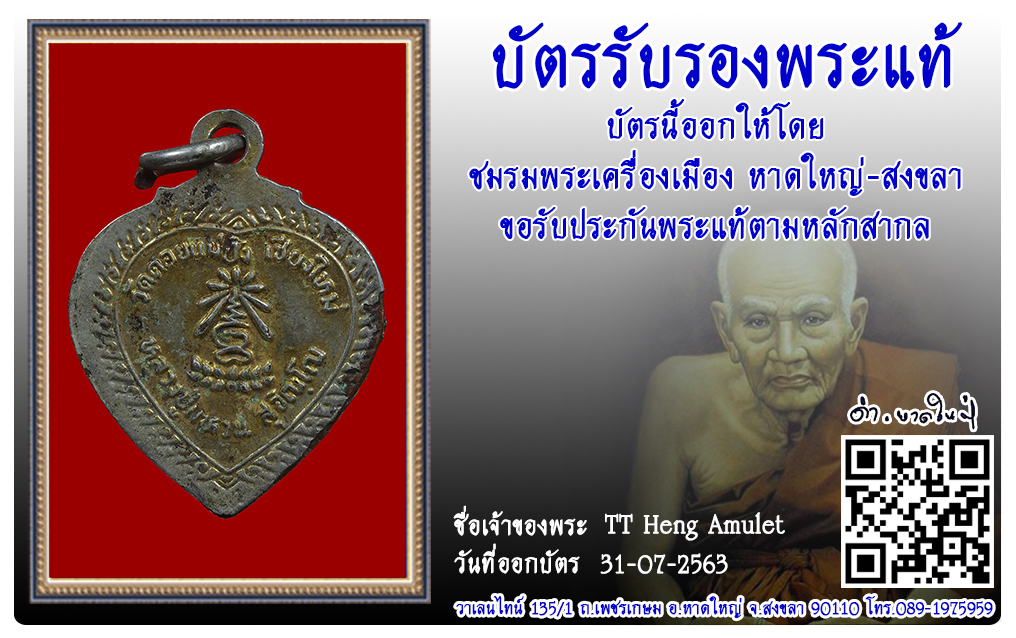 เหรียญหัวใจ วัดดอยแม่ปั๋ง พ.ศ.2520 2563 31 ก.ค. 2020 300 share tweet share ชื่อพระ : เหรียญหัวใจประเภท : พิมพ์เล็ก เนื้อทองแดงวัด-ปี : วัดดอยแม่ปั๋ง พ.ศ.2520รหัส : No.31296วันที่ออกบัตร : 31-07-2563เจ้าของพระ : TT Heng Amulet
