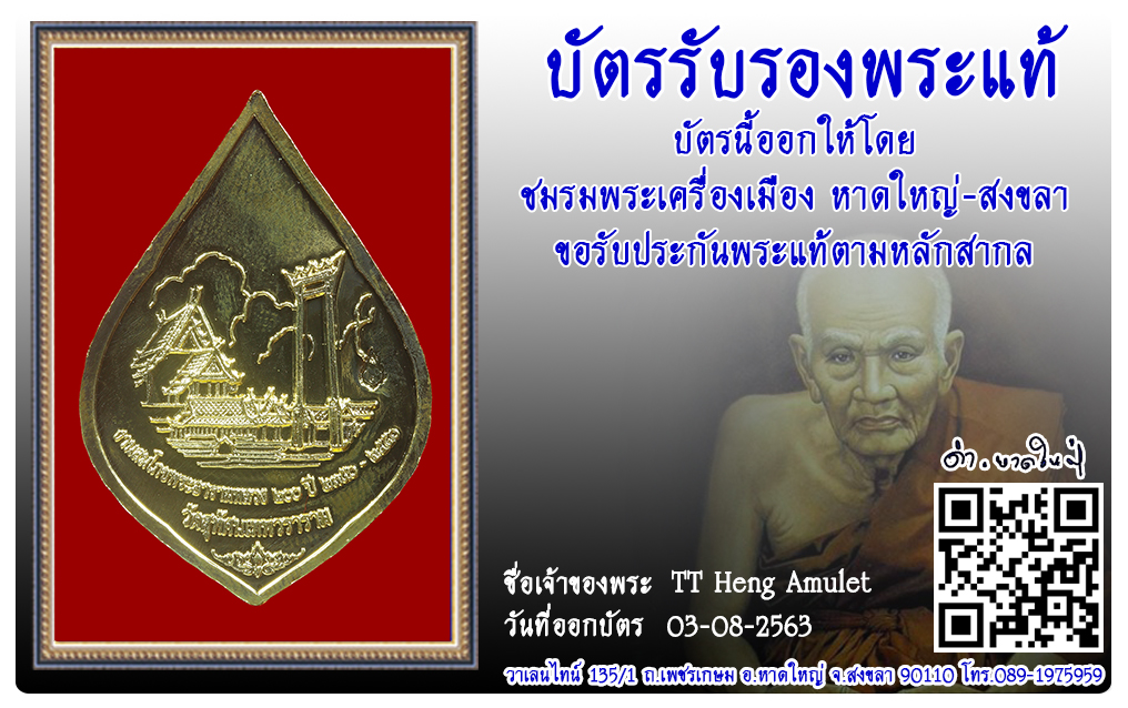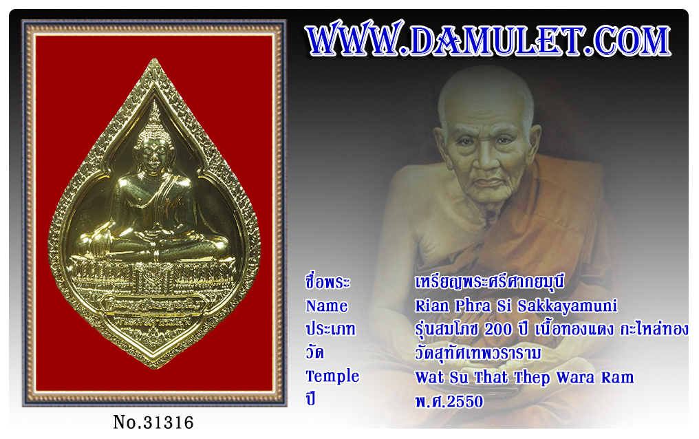 เหรียญพระศรีศากยมุณี วัดสุทัศเทพวราราม พ.ศ.2550 2563 03 ส.ค. 2020 264 share tweet share ชื่อพระ : เหรียญพระศรีศากยมุณีประเภท : รุ่นสมโภช 200 ปี เนื้อทองแดง กะไหล่ทองวัด-ปี : วัดสุทัศเทพวราราม พ.ศ.2550รหัส : No.31316วันที่ออกบัตร : 03-08-2563เจ้าของพระ : TT Heng Amulet