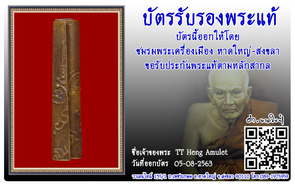 ตะกรุดทองแดง อาจารย์อุทัย วัดวิหารสูง จ.พัทลุง 2563 05 ส.ค. 2020 451 share tweet share ชื่อพระ : ตะกรุดทองแดงชื่อหลวงพ่อ : อาจารย์อุทัยวัด-ปี : วัดวิหารสูง จ.พัทลุงรหัส : No.31344วันที่ออกบัตร : 05-08-2563เจ้าของพระ : TT Heng Amulet