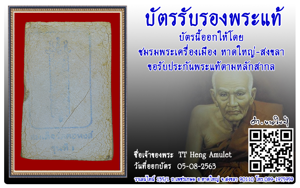 พระสมเด็จ วัดคอหงษ์ จ.สงขลา 2563 05 ส.ค. 2020 1205 share tweet share ชื่อพระ : พระสมเด็จประเภท : พิมพ์พระประธาน รุ่นสร้างพระขวัญเมืองวัด-ปี : วัดคอหงษ์ จ.สงขลารหัส : No.31355วันที่ออกบัตร : 05-08-2563เจ้าของพระ : TT Heng Amulet