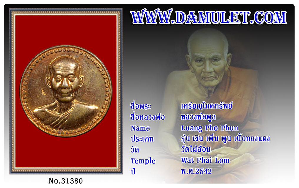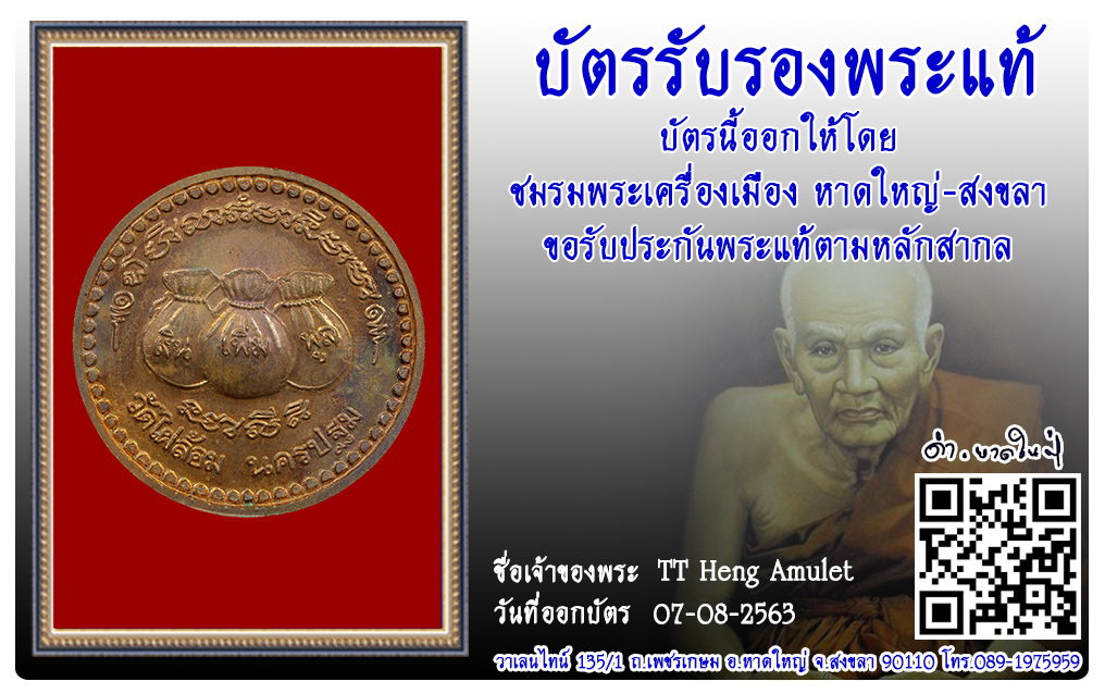 เหรียญโภคทรัพย์ หลวงพ่อพูล วัดไผ่ล้อม พ.ศ.2542 2563 07 ส.ค. 2020 664 share tweet share ชื่อพระ : เหรียญโภคทรัพย์ชื่อหลวงพ่อ : หลวงพ่อพูลประเภท : รุ่น เงิน เพิ่ม พูน เนื้อทองแดงวัด-ปี : วัดไผ่ล้อม พ.ศ.2542รหัส : No.313780วันที่ออกบัตร : 07-08-2563ชื่อเจ้าของพระ : TT Heng Amulet
