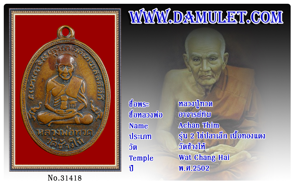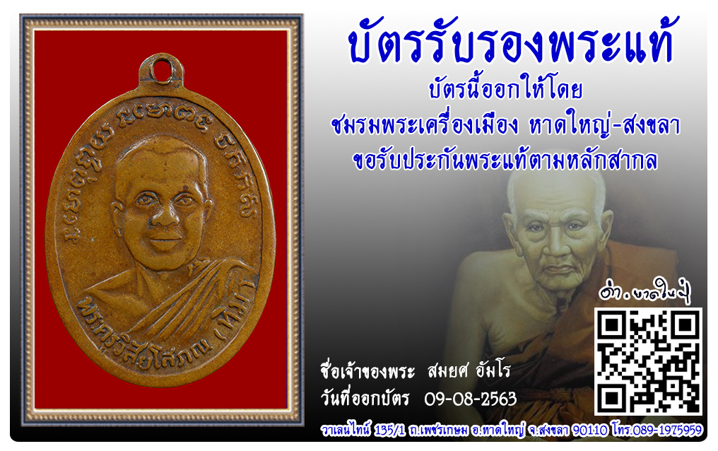 หลวงปู่ทวด อาจารย์ทิม วัดช้างให้ พ.ศ.2502 2563 09 ส.ค. 2020 380 share tweet share ชื่อพระ : หลวงปู่ทวดชื่อหลวงพ่อ : อาจารย์ทิมประเภท : รุ่น 2 ไข่ปลาเล็ก เนื้อทองแดงวัด-ปี : วัดช้างให้ พ.ศ.2502รหัส : No.31418วันที่ออกบัตร : 09-08-2563ชื่อเจ้าของพระ : สมยศ อัมโร