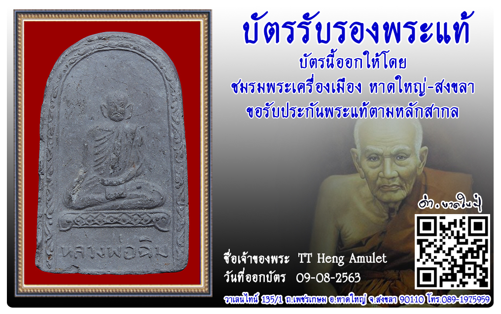 หลวงพ่อฉิม วัดพลานุภาพ พ.ศ.2506 2563 09 ส.ค. 2020 362 share tweet share ชื่อพระ : หลวงพ่อฉิมประเภท : เนื้อว่าน รุ่นแรกวัด-ปี : วัดพลานุภาพ พ.ศ.2506รหัส : No.31422วันที่ออกบัตร : 09-08-2563ชื่อเจ้าของพระ : TT Heng Amulet