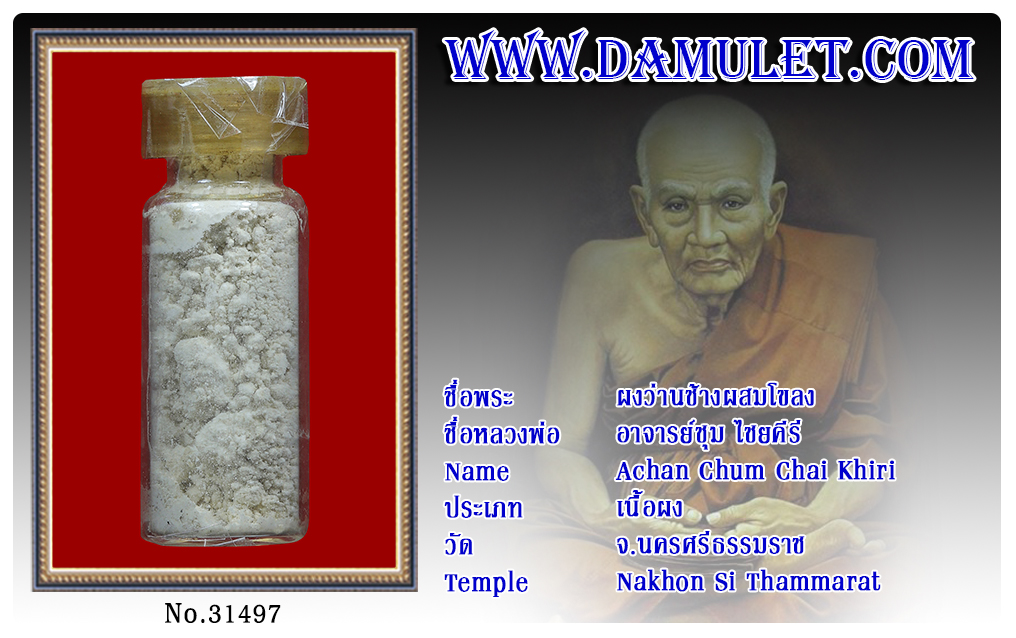 ผงว่านช้างผสมโขลง อาจารย์ชุม ไชยคีรี จ.นครศรีธรรมราช 2563 13 ส.ค. 2020 419 share tweet share ชื่อพระ : ผงว่านช้างผสมโขลงชื่อหลวงพ่อ : อาจารย์ชุม ไชยคีรีประเภท : เนื้อผงวัด-ปี : จ.นครศรีธรรมราชรหัส : No.31497วันที่ออกบัตร : 13-08-2563ชื่อเจ้าของพระ : Jin Thai Amulets