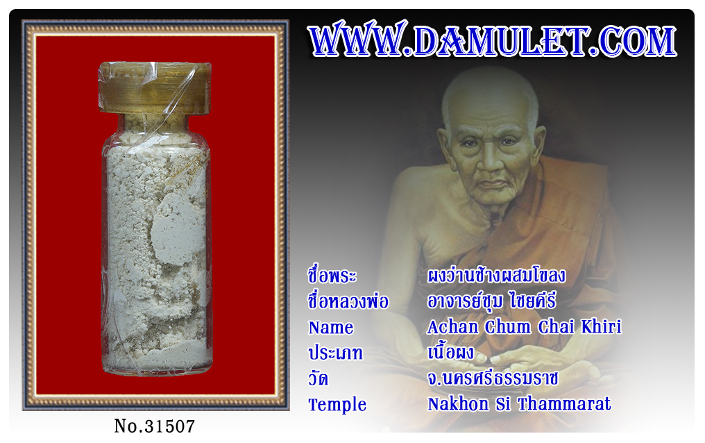 ผงว่านช้างผสมโขลง อาจารย์ชุม ไชยคีรี จ.นครศรีธรรฟมราช 2563 13 ส.ค. 2020 308 share tweet share ชื่อพระ : ผงว่านช้างผสมโขลงชื่อหลวงพ่อ : อาจารย์ชุม ไชยคีรีประเภท : เนื้อผงวัด-ปี : จ.นครศรีธรรมราชรหัส : No.31507วันที่ออกบัตร : 13-08-2563ชื่อเจ้าของพระ : Jin Thai Amulets