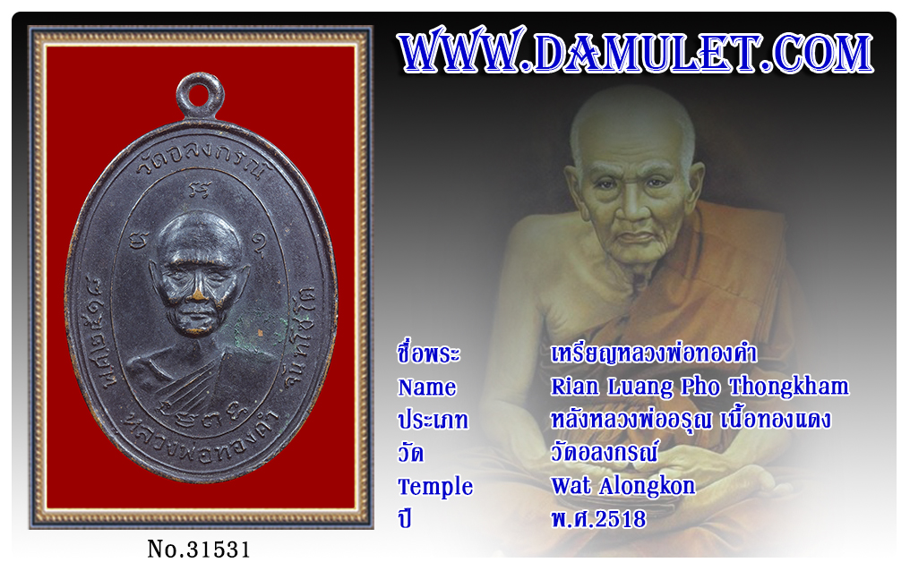 เหรียญหลวงพ่อคำ วัดอลงกรณ์ พ.ศ.2518 2563 16 ส.ค. 2020 532 share tweet share ชื่อพระ : เหรียญหลวงพ่อคำประเภท : หลังหลวงพ่ออรุณ เนื้อทองแดงวัด-ปี : วัดอลงกรณ์ พ.ศ.2518รหัส : No.31531วันที่ออกบัตร : 16-08-2563ชื่อเจ้าของพระ : TT Heng Amulet