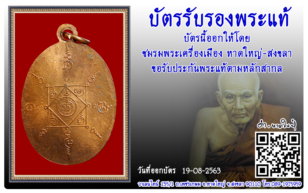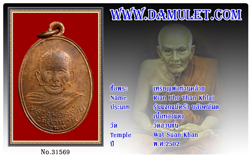เหรียญพ่อท่านคล้าย วัดสวนขัน พ.ศ.2502 2563 19 ส.ค. 2020 433 share tweet share ชื่อพระ : เหรียญพ่อท่านคล้ายประเภท : รุ่นแจกแม่ครัว บล็อคมีผด เนื้อทองแดงวัด-ปี : วัดสวนขัน พ.ศ.2502รหัส : No.31569วันที่ออกบัตร : 19-08-2563
