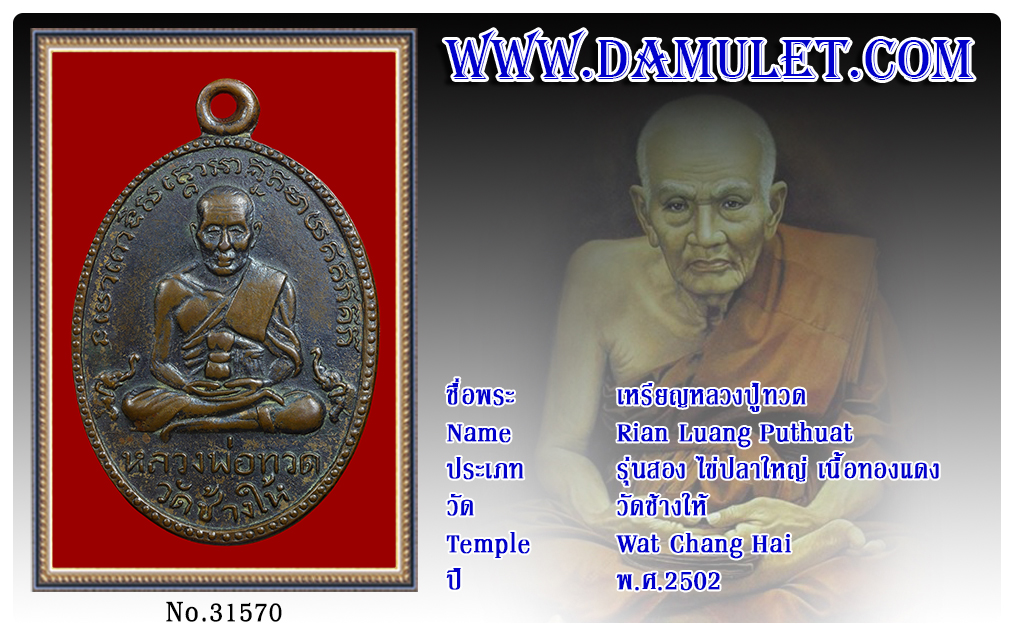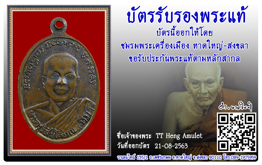 เหรียญหลวงปู่ทวด วัดช้างให้ พ.ศ.2502 2563 21 ส.ค. 2020 351 share tweet share ชื่อพระ : เหรียญหลวงปู่ทวดประเภท : รุ่นสอง ไข่ปลาใหญ่ เนื้อทองแดงวัด-ปี : วัดช้างให้ พ.ศ.2502รหัส : No.31570วันที่ออกบัตร : 21-08-2563ชื่อเจ้าของพระ : TT Heng Amulet